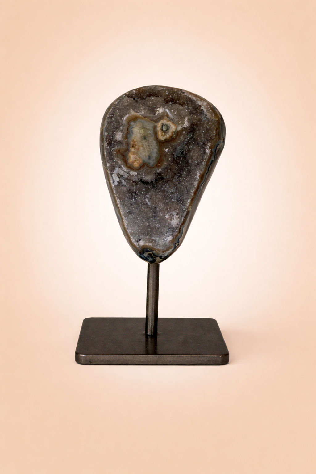 Esta geoda de ágata natural destaca por sus formaciones cristalizadas en tonos neutros, creando un juego de texturas y profundidad que aporta elegancia y armonía a cualquier espacio.