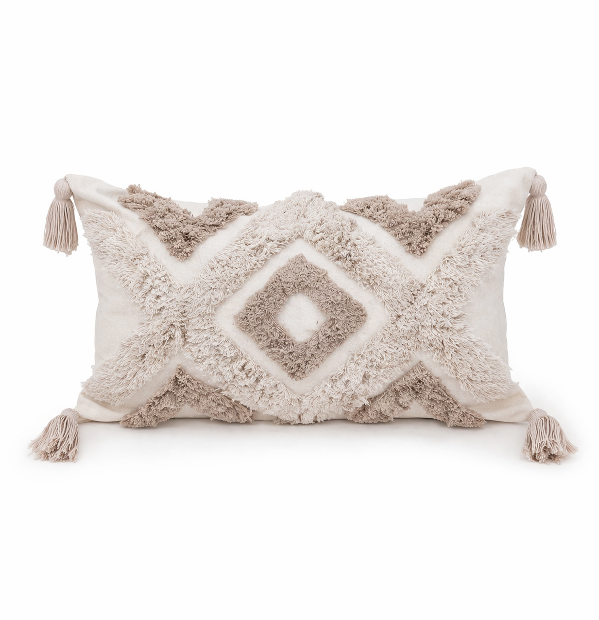 Este almohadón combina una base en tono natural con detalles en relieve de inspiración geométrica, creando un juego de texturas que aporta profundidad y estilo. Las borlas en sus extremos suman ese toque bohemio y relajado que define ambientes cálidos y con personalidad.