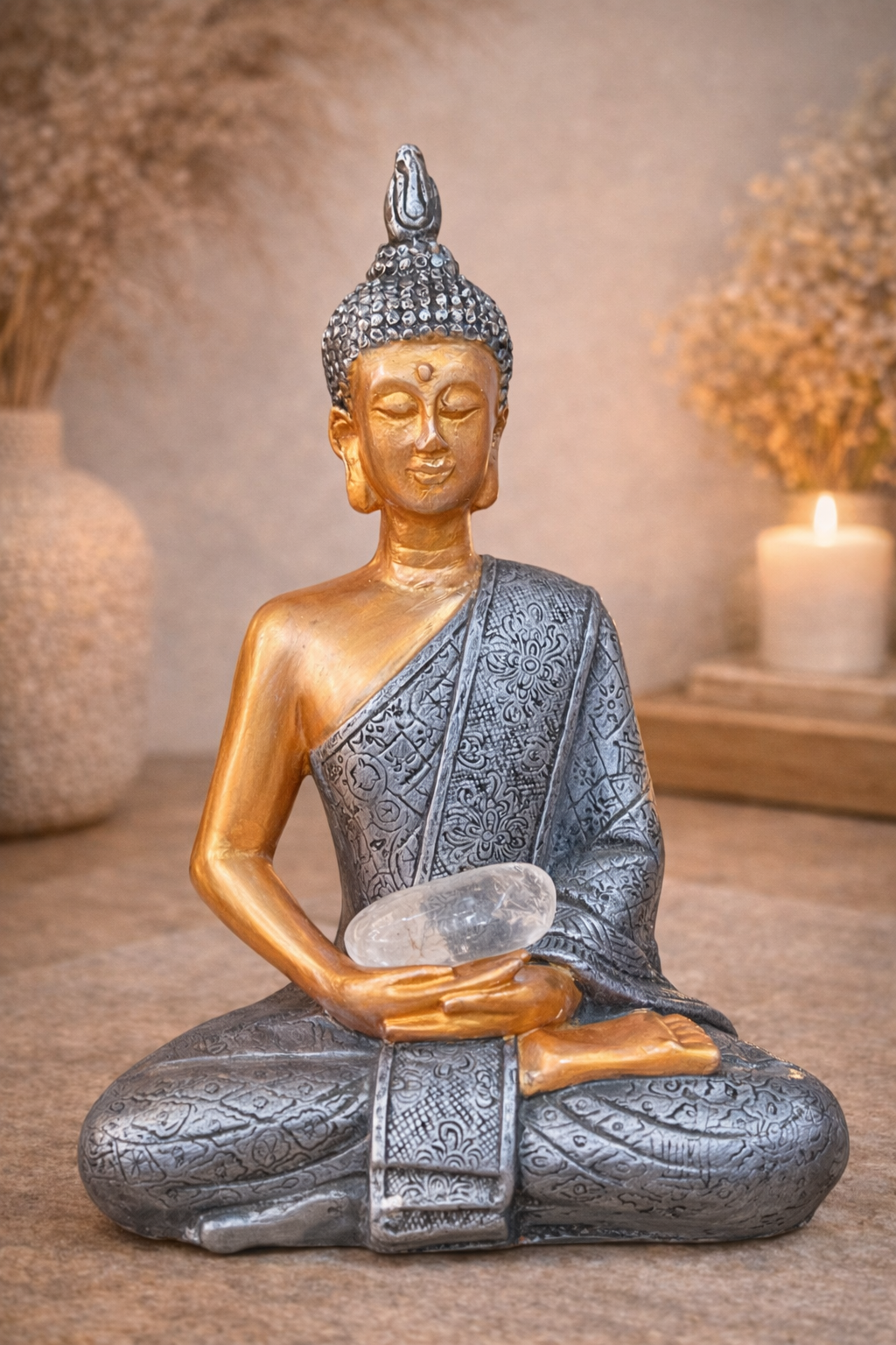 Este Buda en tonos dorados y grises combina detalles artesanales con un cuarzo transparente, símbolo de claridad, equilibrio y amplificación energética.