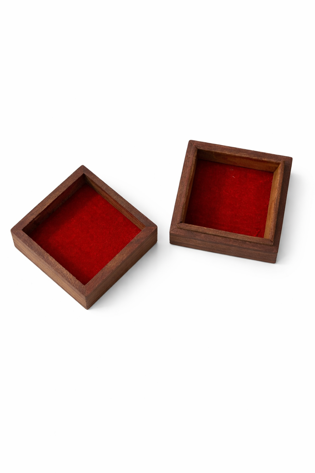 Caja decorativa de madera con interior revestido en terciopelo rojo, ideal para guardar pequeños objetos con estilo y calidez. Su diseño simple y artesanal resalta la belleza natural de la madera, mientras que el interior suave la convierte en una opción perfecta para joyas, amuletos o piezas especiales.