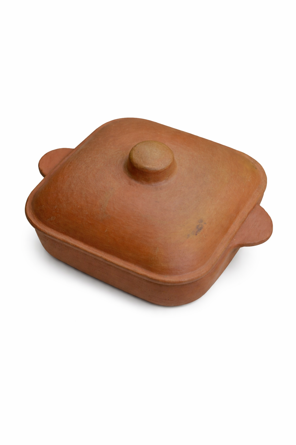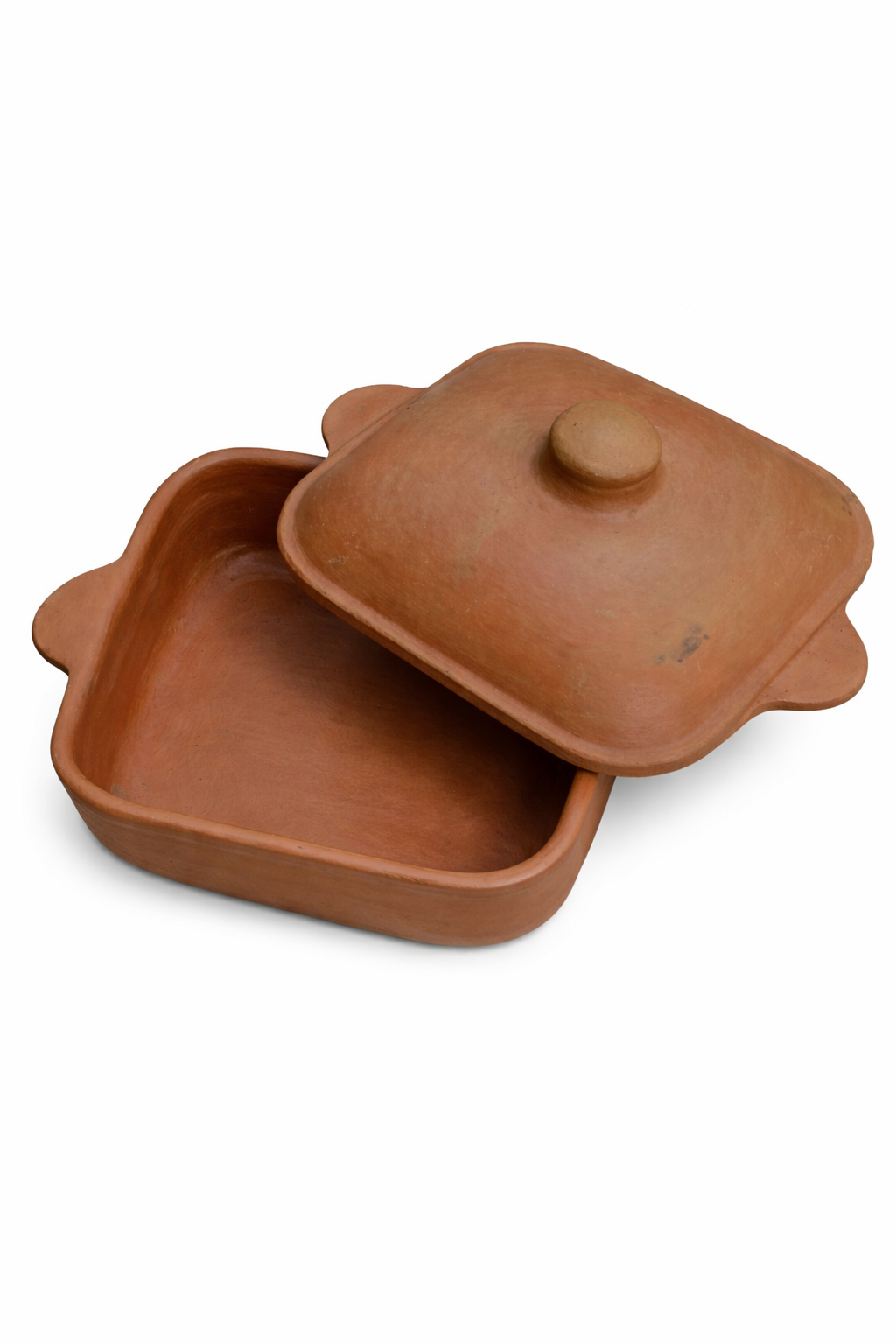 Cazuela de barro artesanal, ideal para cocinar y servir con un toque rústico y auténtico. Su diseño de líneas suaves y forma cuadrada con tapa permite conservar el calor de los alimentos, logrando cocciones más naturales y sabrosas.