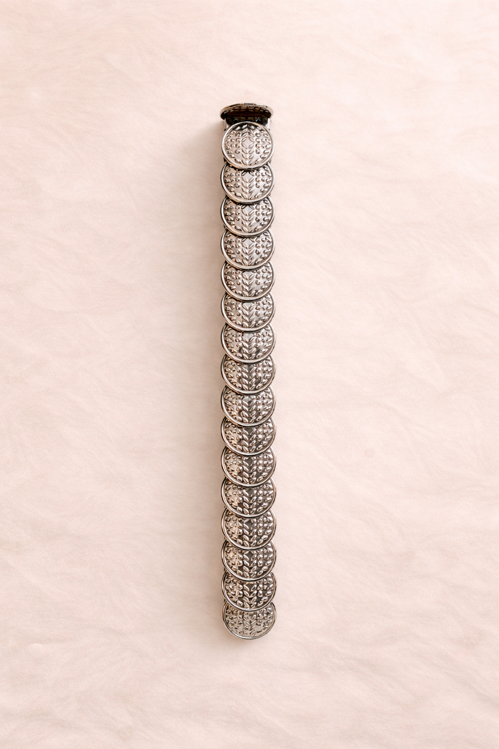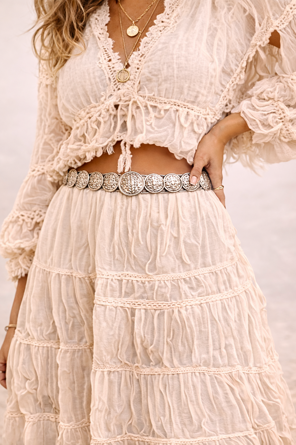 Este cinto de monedas en acabado metálico trabajado aporta carácter, textura y un aire bohemio sofisticado que define la esencia de Lumma. Cada pieza está cuidadosamente labrada, generando un efecto visual único que capta la luz y realza la silueta.
