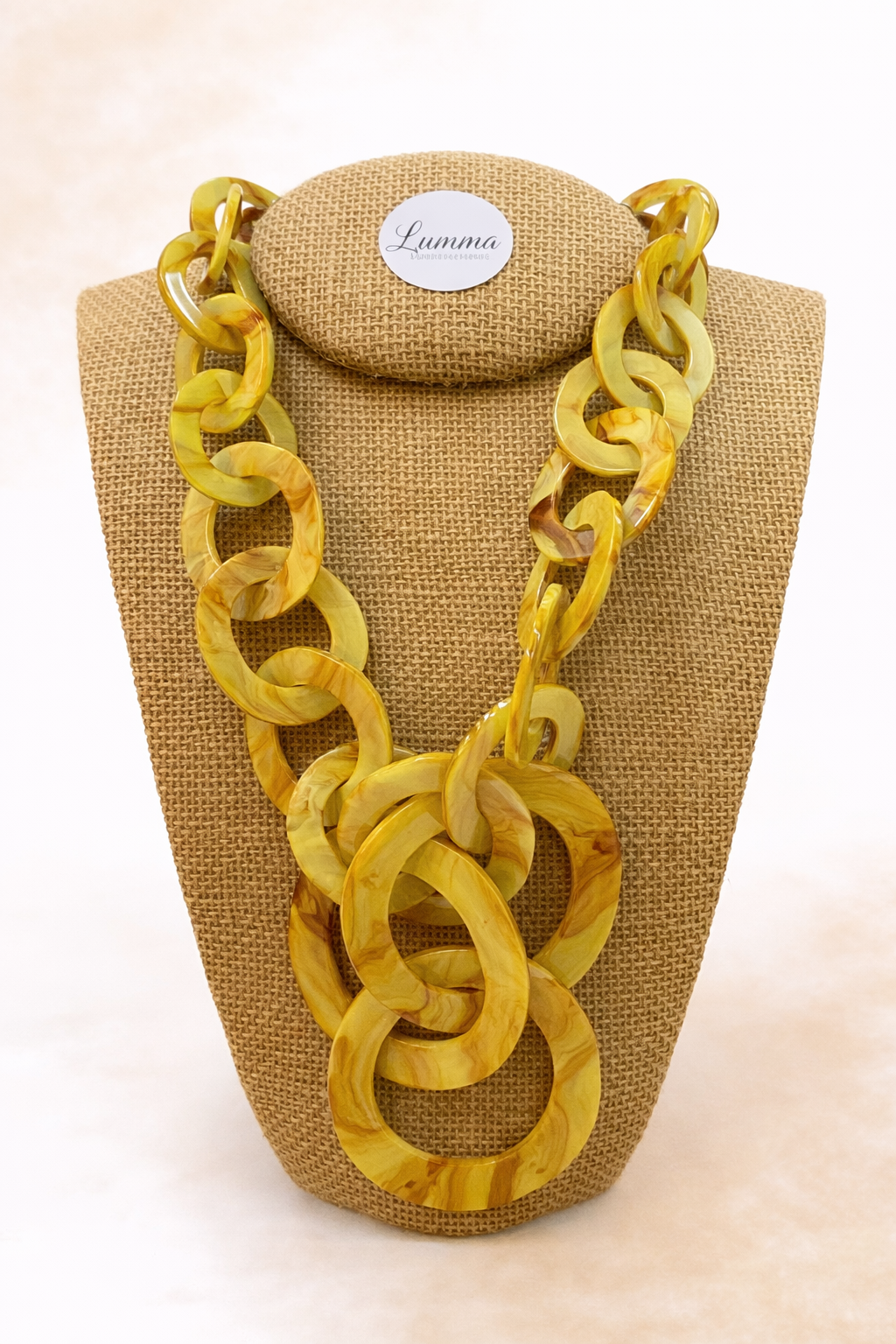 Un collar protagonista que transforma cualquier look. Su diseño de eslabones XL en resina marmolada combina tonos ámbar, miel y dorado, creando una pieza cálida, elegante y con mucha personalidad.