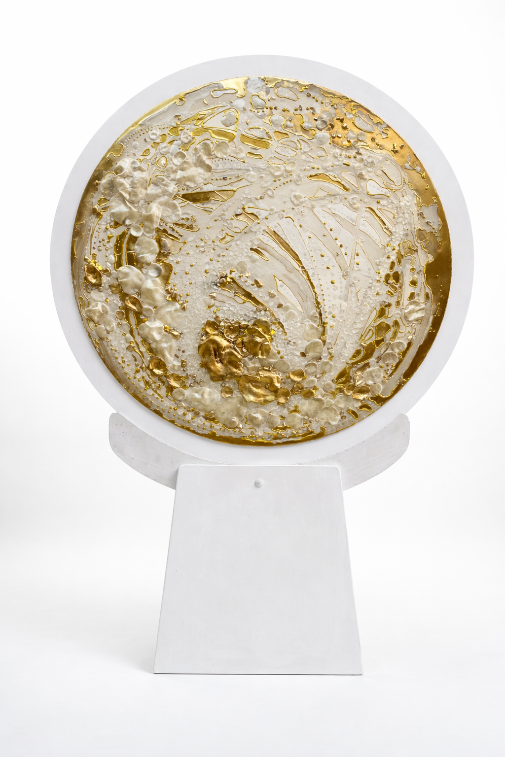 Obra decorativa artesanal de gran impacto visual, elaborada en resina artística con detalles en tonos blanco perla, transparencias cristalinas y acentos dorados metálicos. Su composición circular genera un efecto visual dinámico que combina relieves orgánicos, burbujas encapsuladas y trazos fluidos que evocan formas naturales y paisajes abstractos.