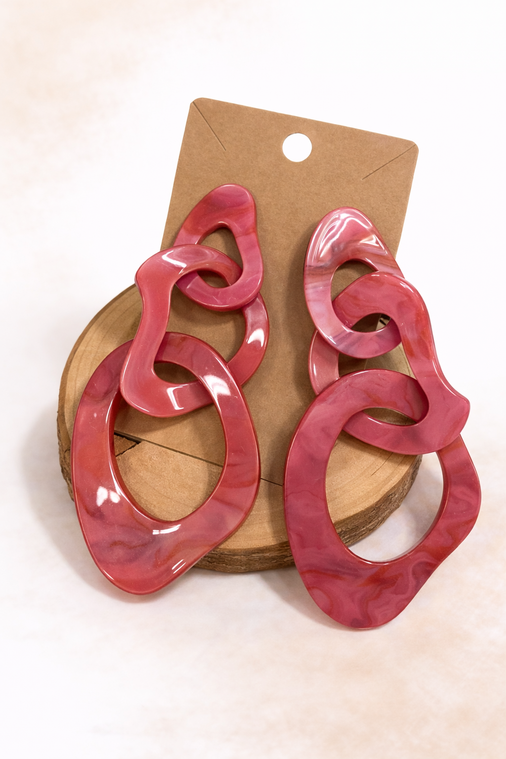 Aros protagonistas que elevan cualquier look. Su diseño de eslabones orgánicos en resina rosa crea una pieza moderna, liviana y con mucha personalidad.