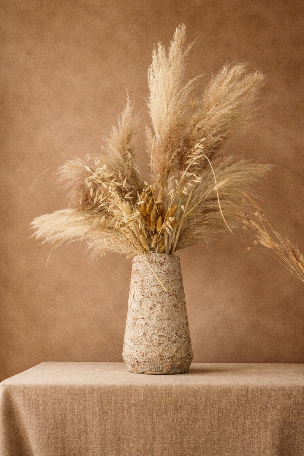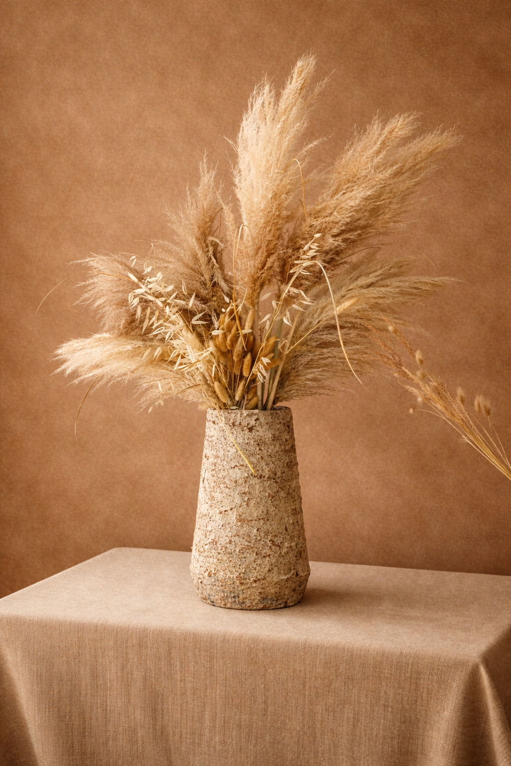 Pieza decorativa de estilo bohemio que combina un florero de acabado texturizado con un delicado arreglo de fibras naturales seleccionadas. Las plumas de pampas, avena seca y detalles orgánicos aportan calidez, movimiento y una estética relajada que eleva cualquier espacio.