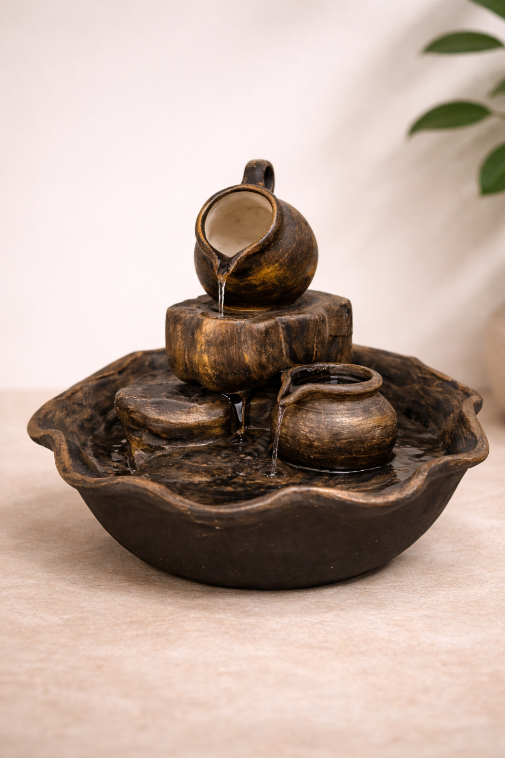 Esta fuente de agua de cerámica, con diseño artesanal y tonos cálidos envejecidos, crea un flujo suave y constante que invita a bajar el ritmo y conectar con el presente. El sonido del agua en movimiento genera una sensación inmediata de paz, ideal para acompañar momentos de descanso, meditación o simplemente para armonizar tu hogar.
