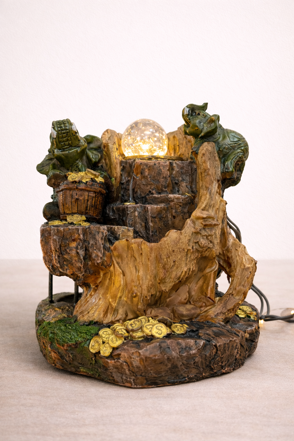 Una pieza que combina diseño, simbolismo y energía en un solo objeto. Esta fuente decorativa representa la abundancia y la prosperidad a través de sus detalles: monedas doradas, figuras protectoras y el flujo constante del agua que activa la energía del espacio.