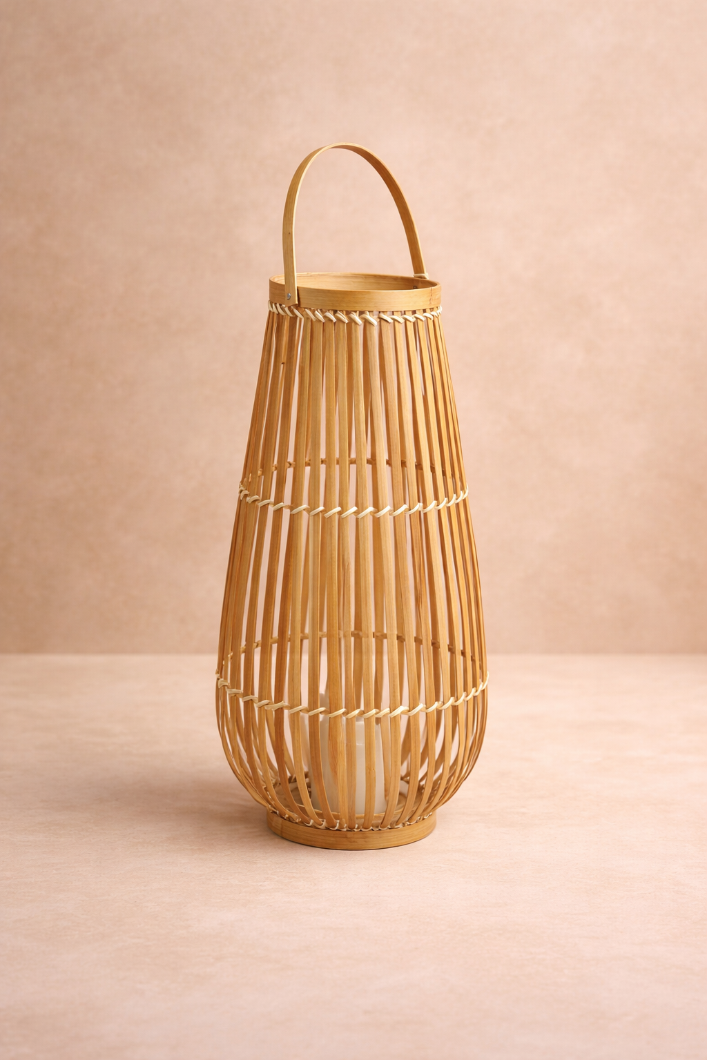 Esta lámpara de bambú, de diseño artesanal y líneas orgánicas, aporta textura y naturalidad a cualquier espacio. Su estructura liviana y su forma envolvente permiten que la luz se filtre suavemente, generando una atmósfera relajada y acogedora.