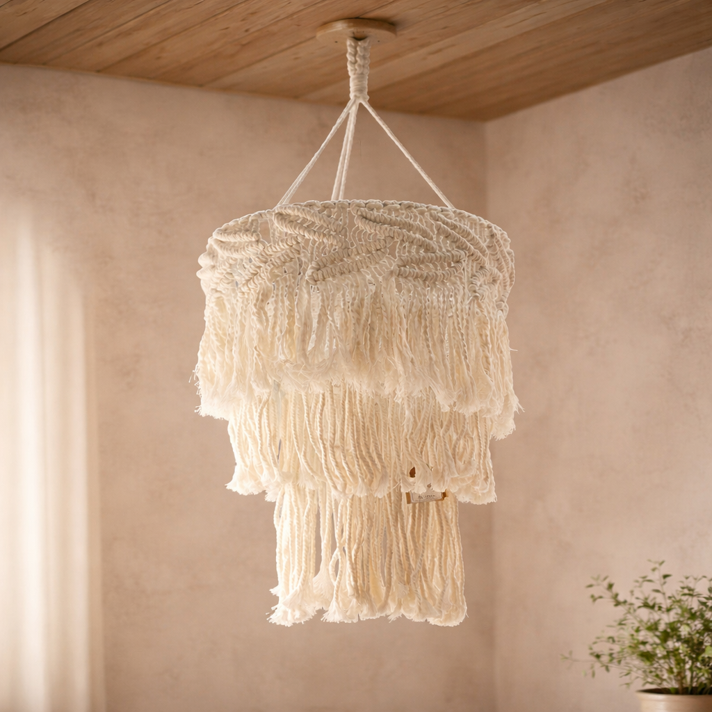 Sus capas de flecos generan una caída orgánica y envolvente, mientras que la luz se filtra suavemente entre las fibras, aportando calidez y profundidad al ambiente.