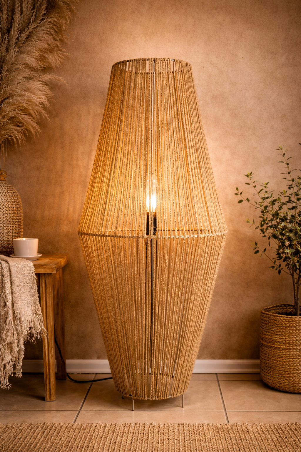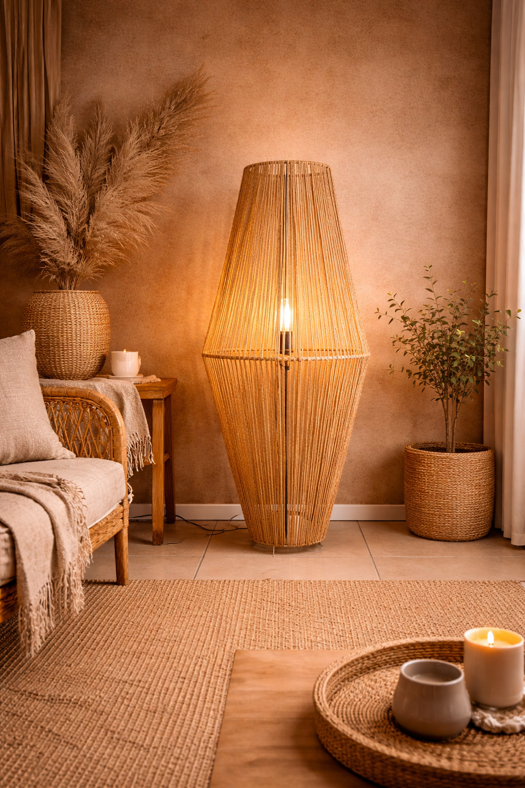 Esta lámpara de pie artesanal está confeccionada en fibras naturales, con un diseño orgánico y envolvente que filtra la luz de forma suave, creando una atmósfera íntima y relajante.