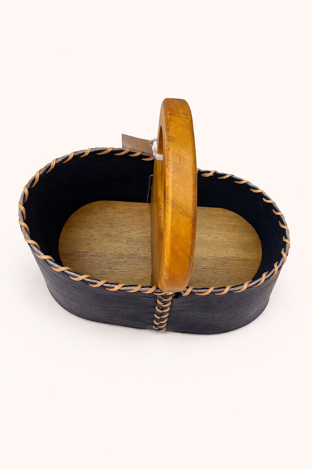 Su diseño artesanal, con costuras visibles y remaches metálicos, resalta el trabajo hecho a mano, mientras que la manija de madera brinda firmeza y comodidad al transportar.