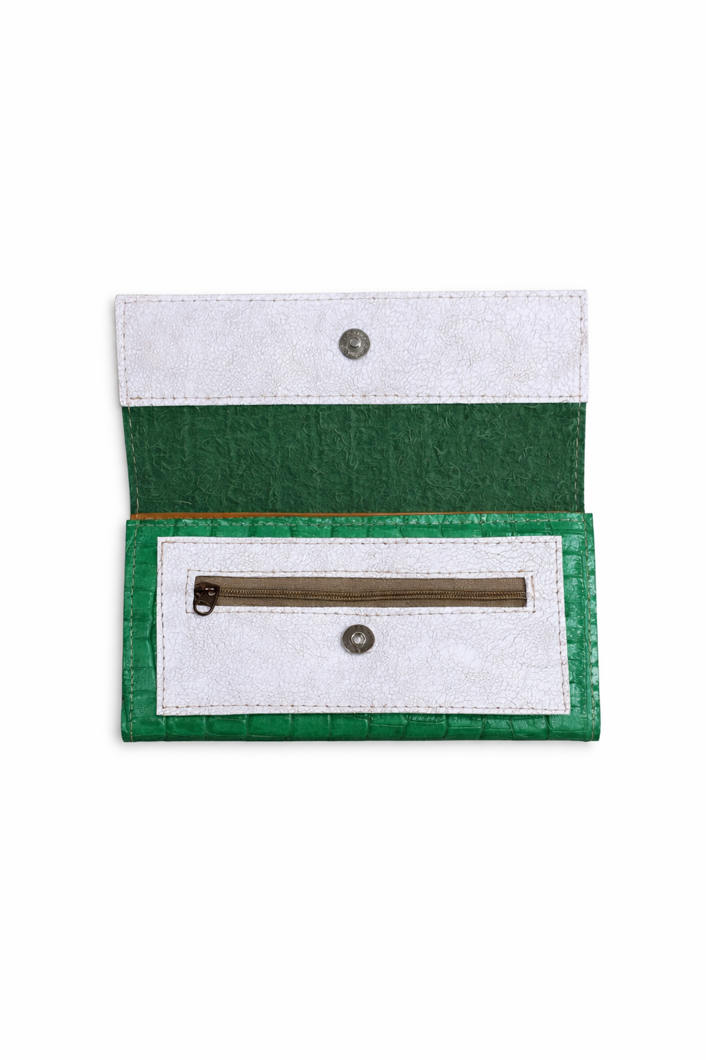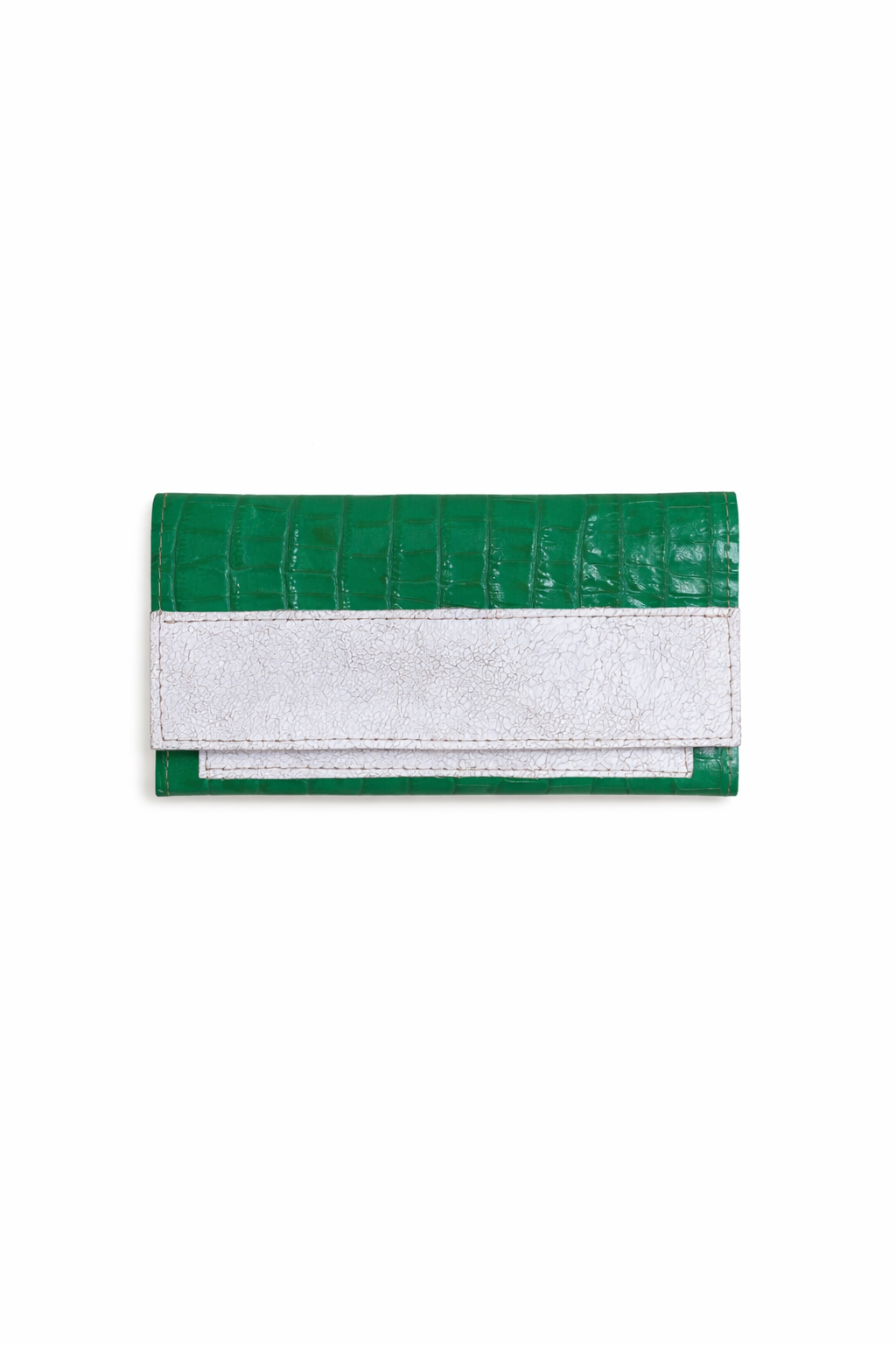 Monedero de cuero Lola Bate con una combinación única de tonos verdes y naturales que reflejan un estilo auténtico y artesanal. Su diseño interior ofrece múltiples compartimentos para tarjetas, permitiendo una organización práctica y funcional en el día a día.