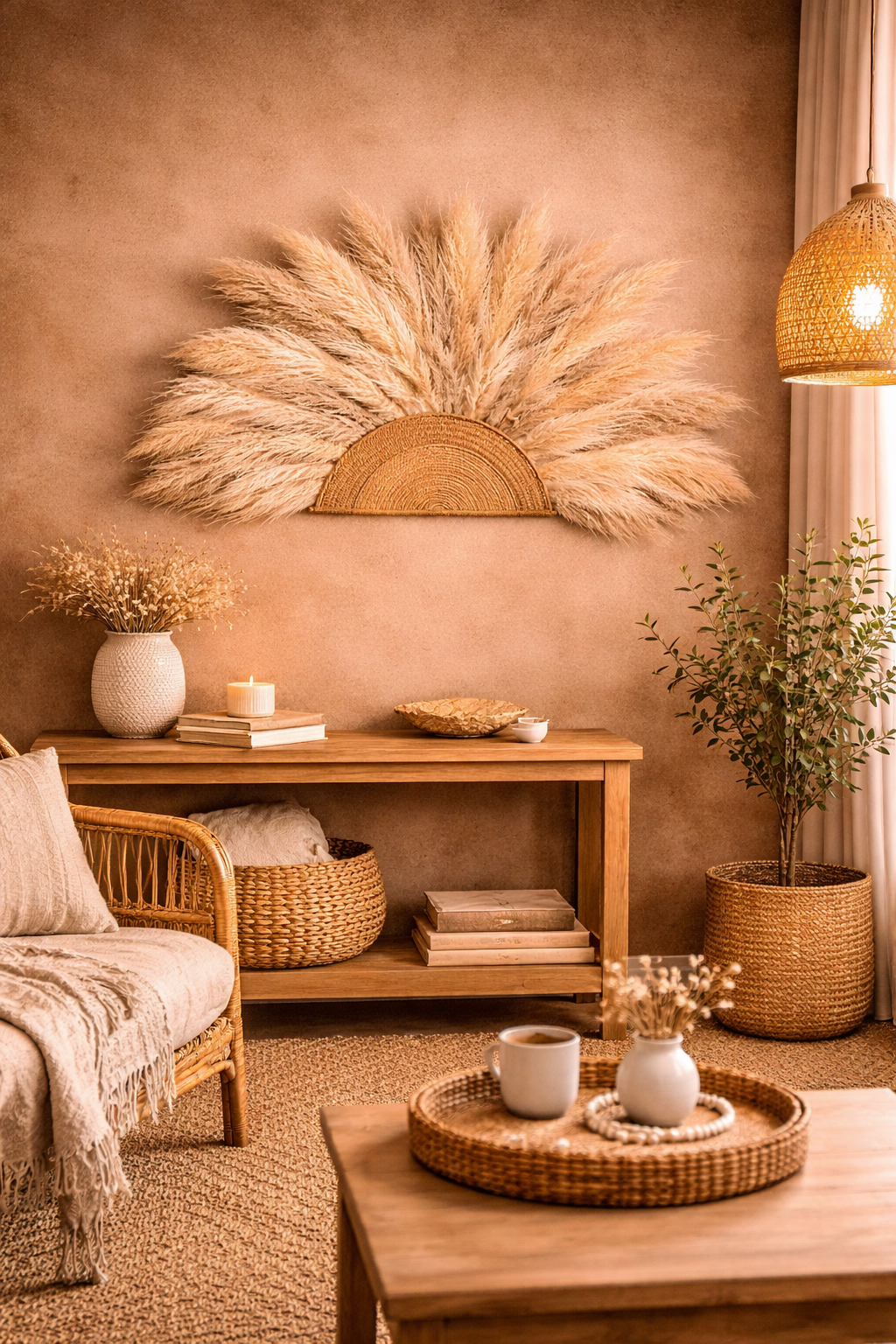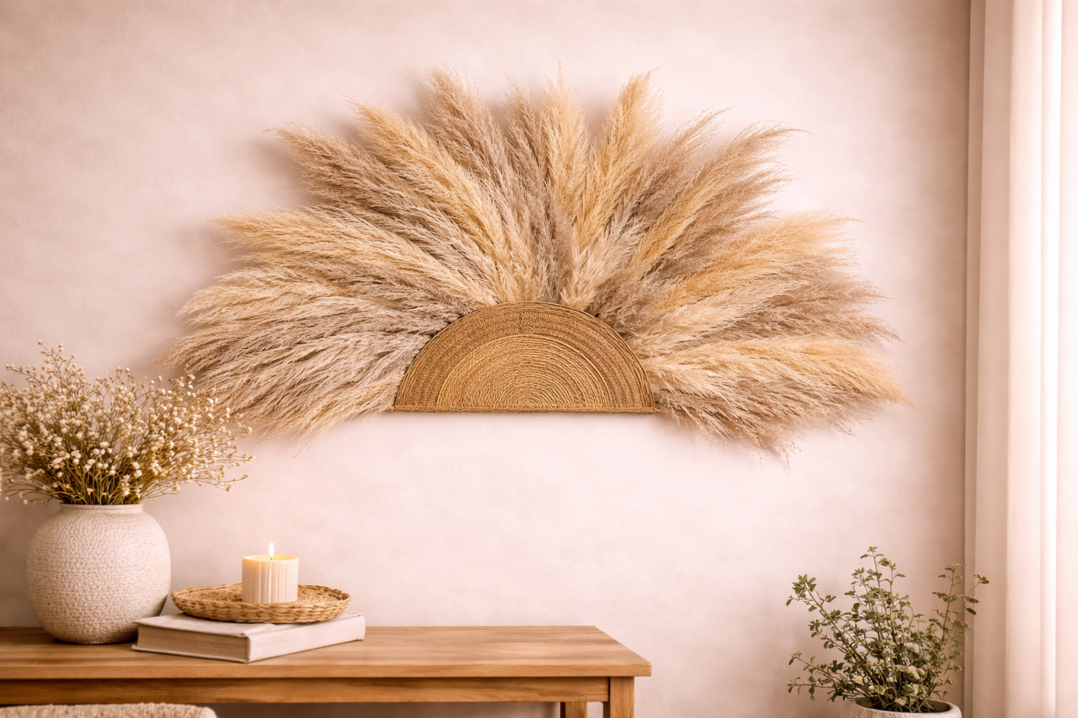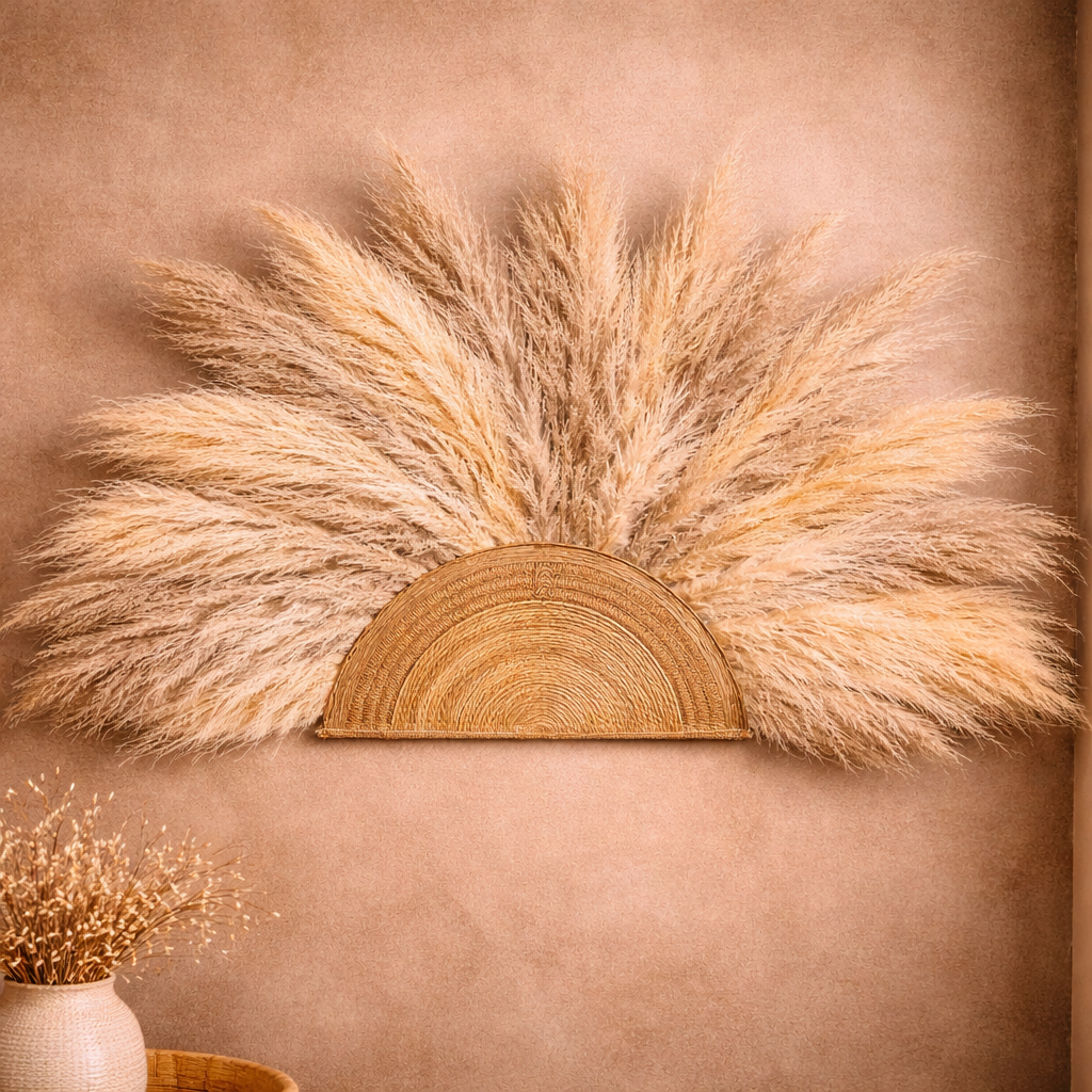 Este diseño artesanal combina una base tejida en fibras naturales con la suavidad orgánica de las plumas de pampas, creando una composición visual envolvente y sofisticada.