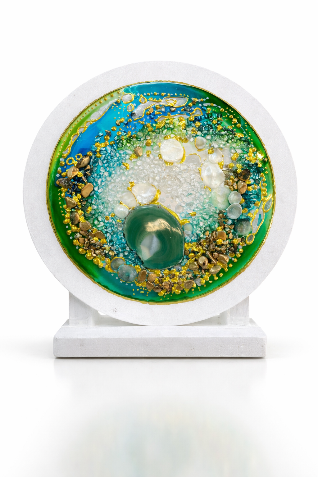Elegante pieza decorativa artesanal inspirada en las formas naturales de las geodas y los minerales. Esta placa está elaborada en resina de alta calidad y combina tonalidades verdes, turquesas y azules que crean un efecto visual profundo y sofisticado.