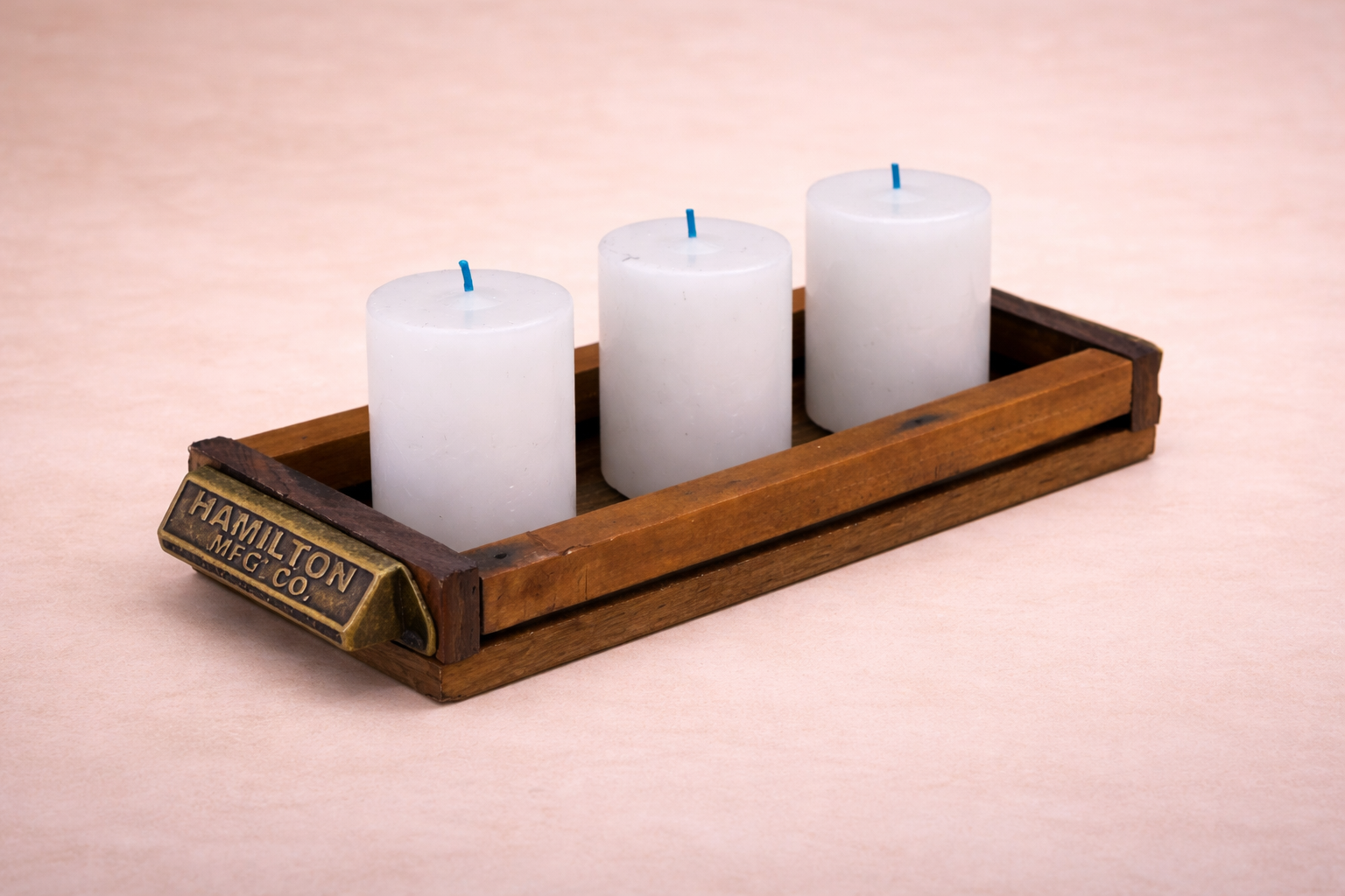 Su estructura rectangular sostiene tres velas tipo pilar, creando una composición armoniosa ideal para mesas, livings o rincones especiales del hogar. La madera aporta textura y calidez, mientras que el detalle metálico le suma un toque sutil de estilo.