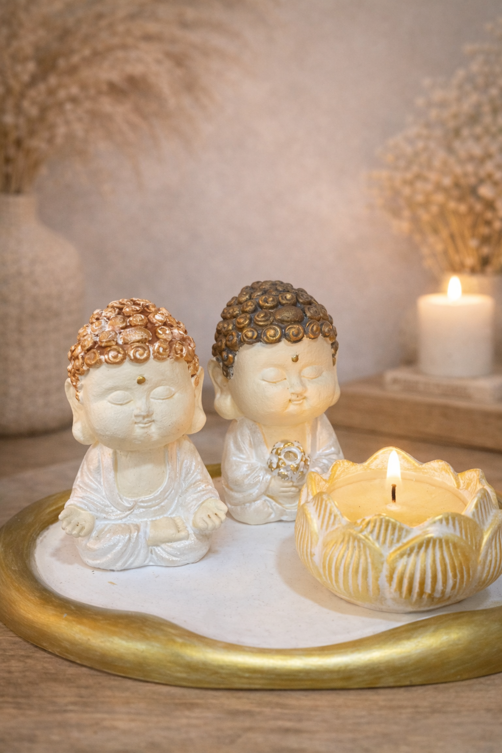 Este delicado set combina dos figuras de Buda con un portavelas en forma de flor, generando una atmósfera cálida, armoniosa y llena de intención.