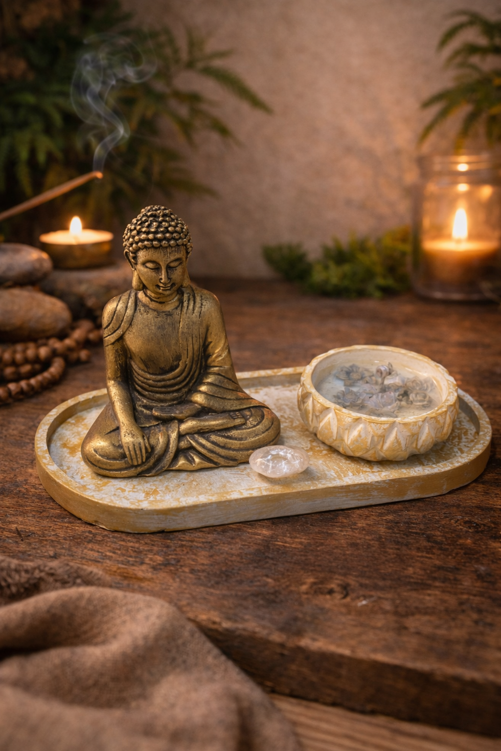 Este set combina la presencia serena de Buda con un cuenco para sahumerios y detalles que invitan a crear un ritual diario de calma.