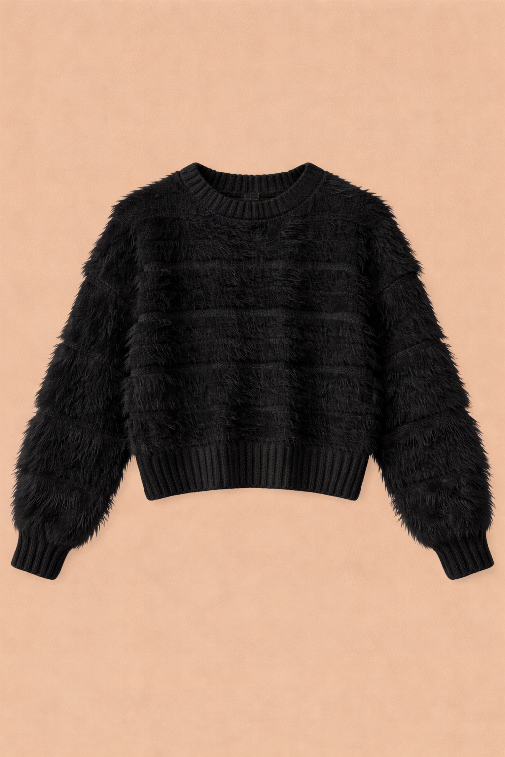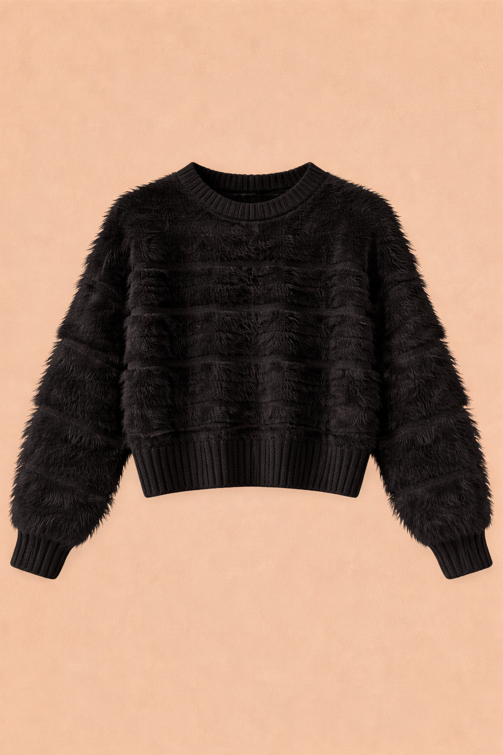 Suéter en tono total negro, con textura peluda suave que aporta un look cálido, delicado y súper acogedor. Su diseño combina franjas de pelo con tejido, generando un equilibrio perfecto entre confort y estilo.