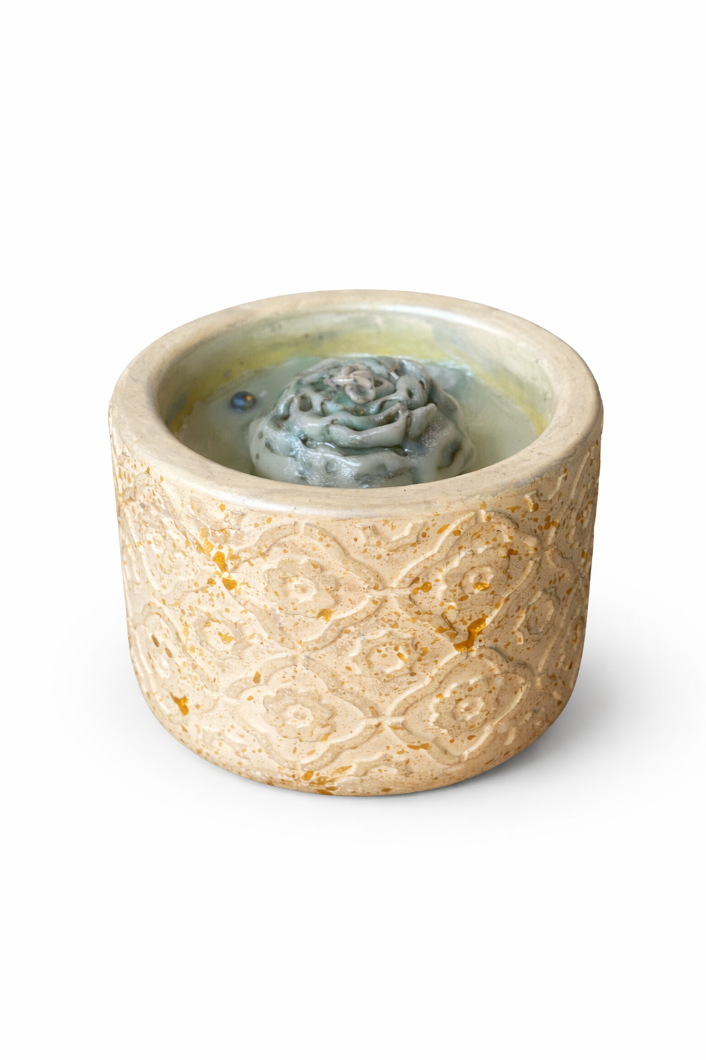 Esta vela en forma de flor, presentada en un cuenco cerámico texturado con delicados detalles, crea una experiencia visual y sensorial única.